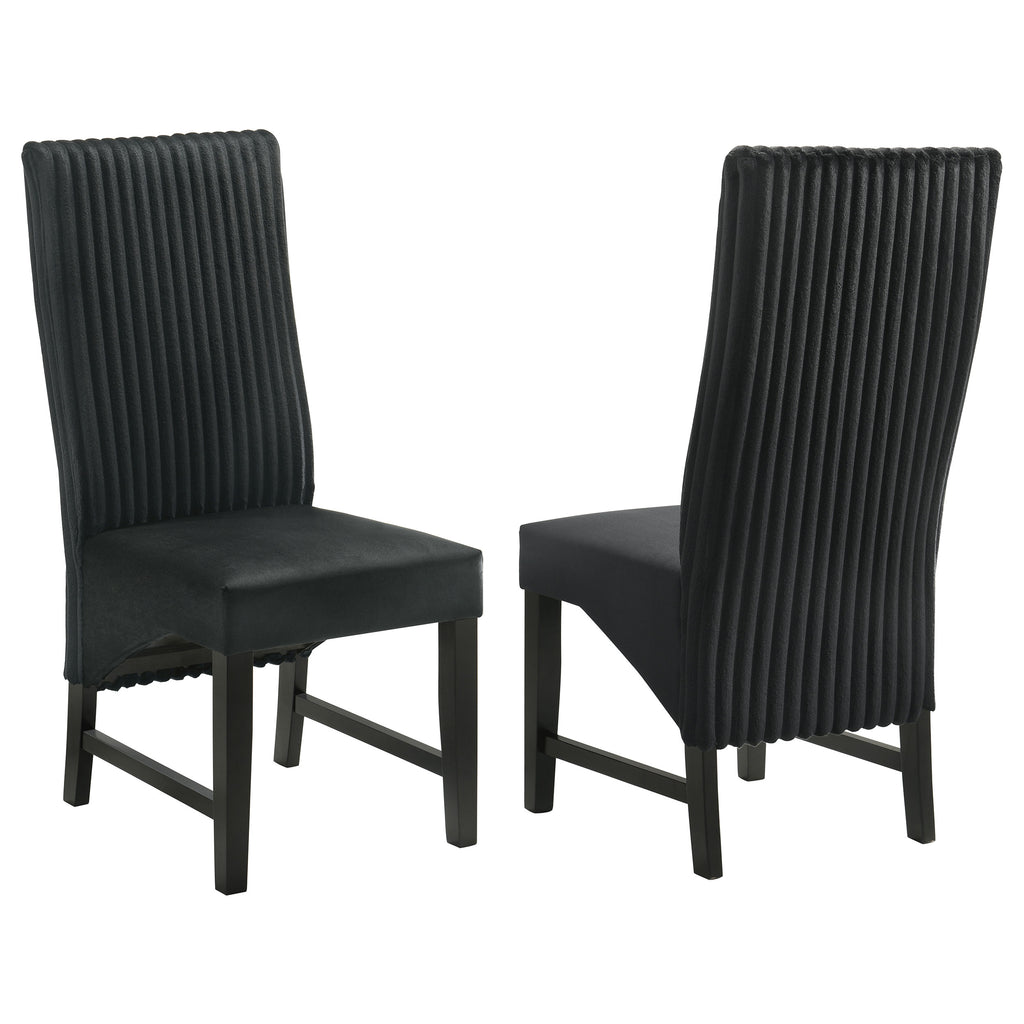 Elevate your dining space with these sophisticated dining chairs, blending textures and luxurious fabrics for a modern, elegant look. The seat back features wide channel corduroy upholstery, adding rich texture and a stylish visual contrast. The seat itself is covered in plush velvet fabric, ensuring a soft and comfortable seating experience. Supported by sturdy black-finished wooden legs, these chairs offer both durability and a sleek, contemporary silhouette. Whether for casual meals or formal gatherings, these chairs bring chic style to your dining area.