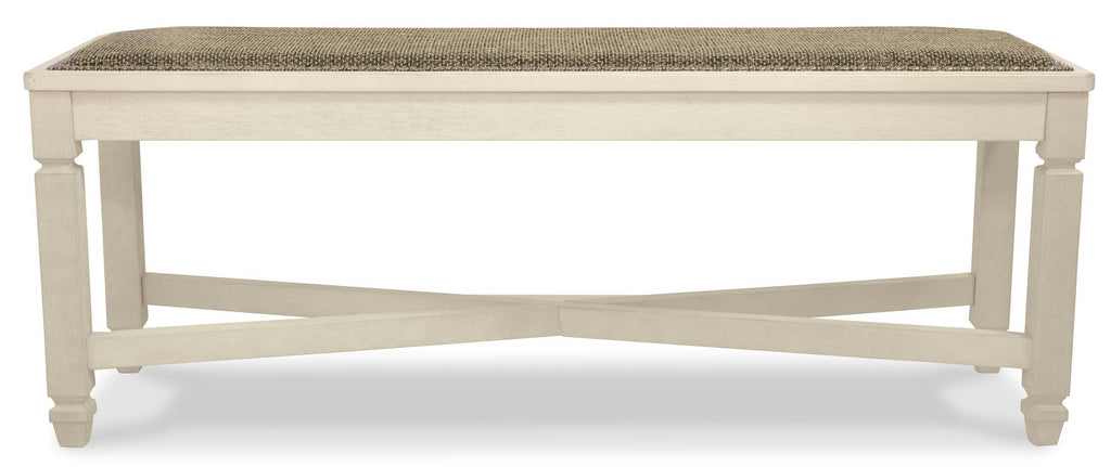 The beauty of this upholstered dining bench is something to savor. Serving up comfort and flair, this generously scaled bench entices with a cushioned seat covered in a heavy woven fabric that complements the antiqued white finish.