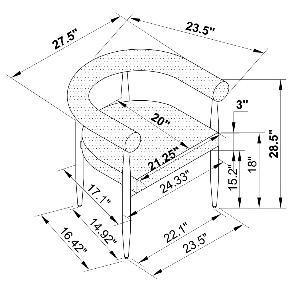 Reimagine your dining room with the fresh, elegant character of a five-piece modern dining set. Centered on a round table with a faux black marble tabletop, the set offers compelling contrast and dimension in a kitchen or dining room. The tabletop is printed black melamine, designed to provide seamless character at an affordable price point. The base of the table is a star pedestal crafted in hammered black metal, offering artistic flair to your space. Four side chairs complete the set, pairing black hammered legs with plush cream upholstery with charming texture and plush cushioning.