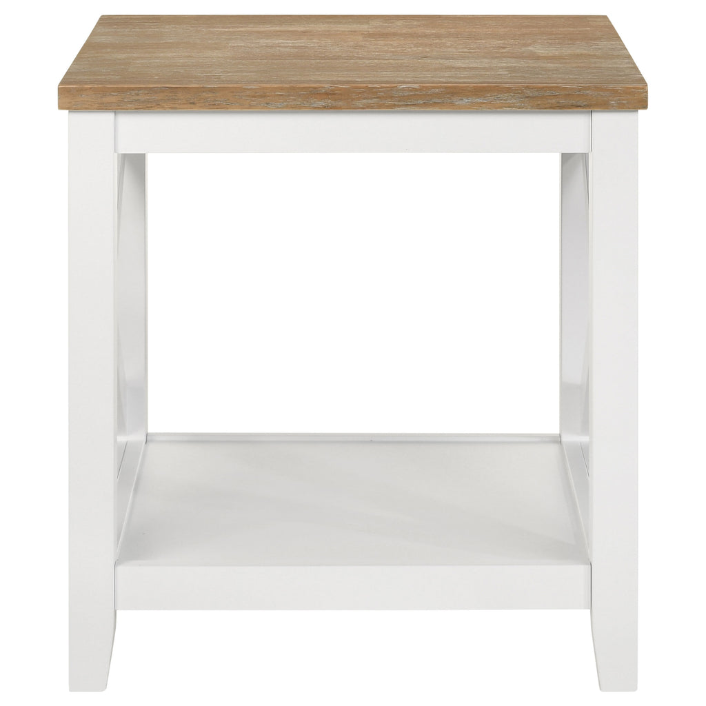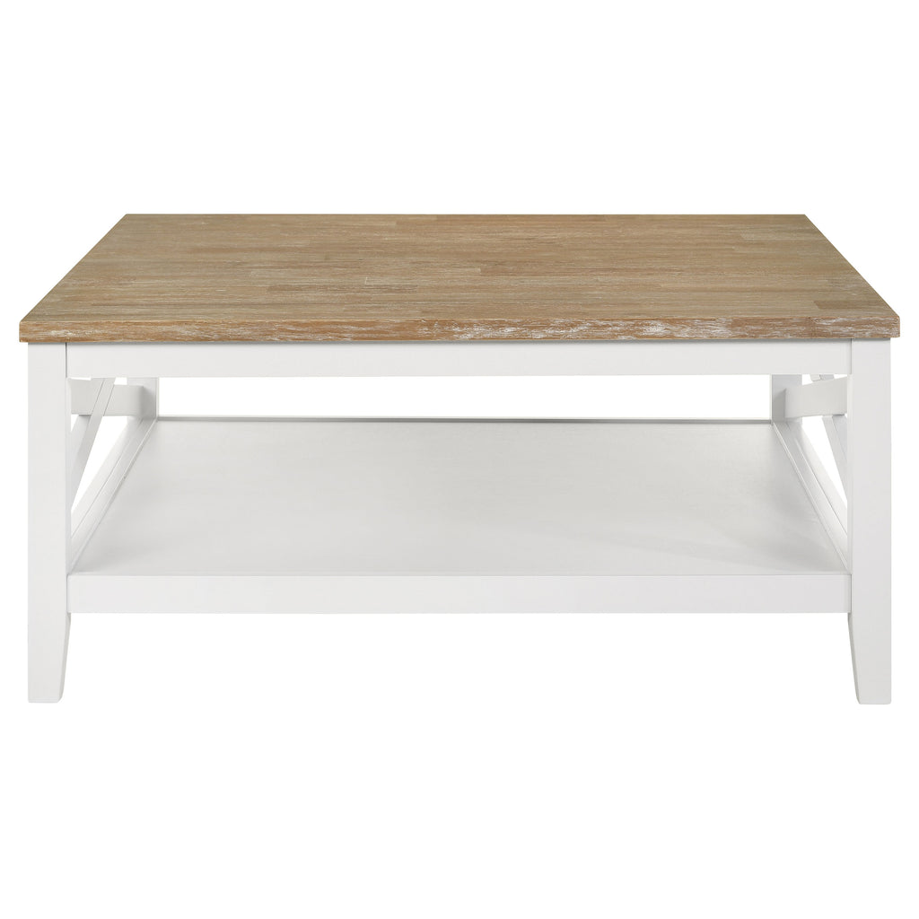 Elevate your living space with this farmhouse-inspired coffee table set, perfect for casual and cozy settings. The two-tone design features wire-brushed ash veneer tops in a warm brown finish paired with crisp white bases. Each piece showcases X-cross side accents that add charming detail, while open lower shelves offer ample space for storage or display. Built with durable engineered wood and Asian hardwood, this set is both stylish and practical, blending seamlessly into cottage and coastal decor.