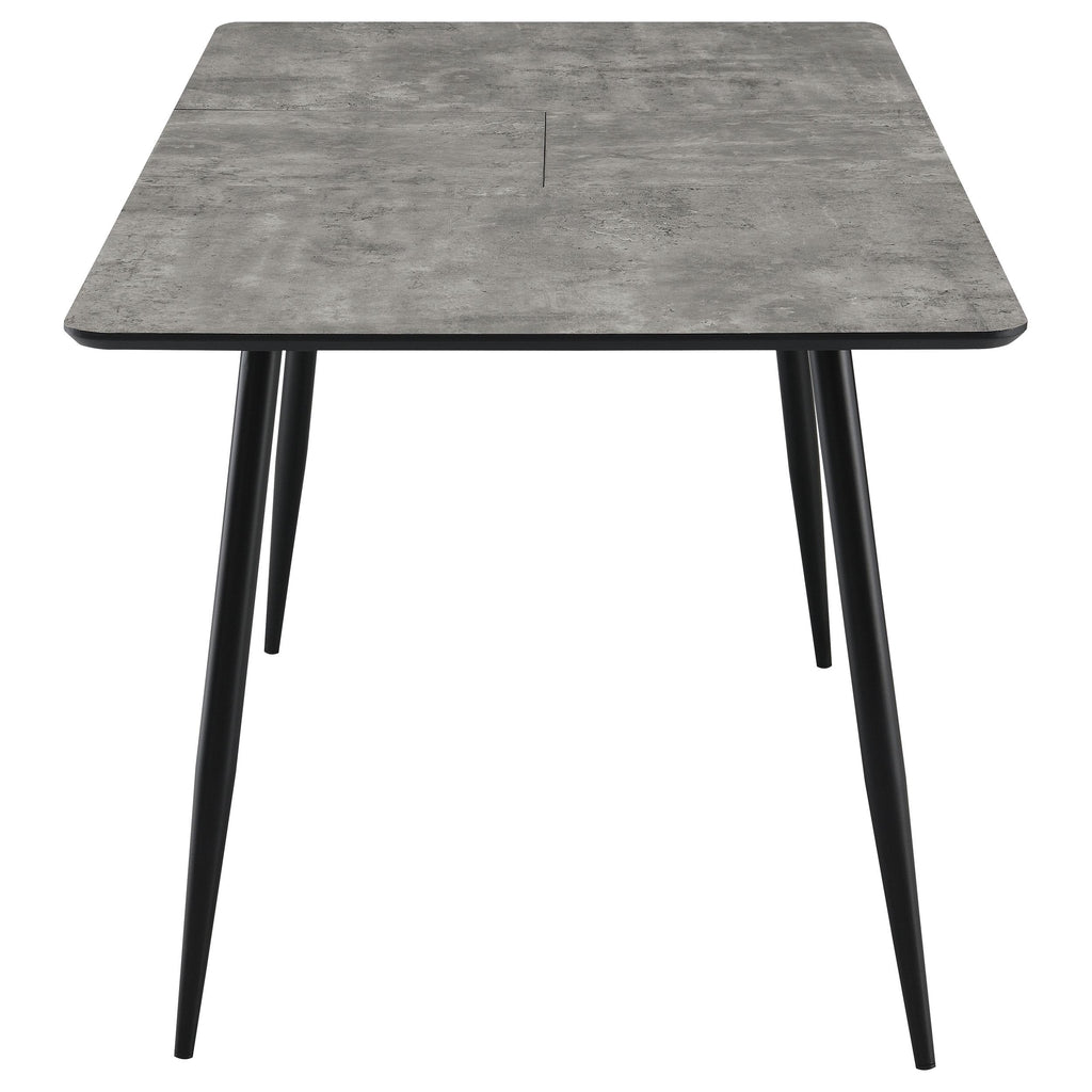 This modern dining table features a sleek grey tabletop finish paired with black tapered legs, creating a sophisticated two-tone design. The table includes a 15. 75-inch butterfly leaf, extending its length from 47. 25 to 63 inches, perfect for accommodating guests or everyday meals. Crafted with HD melamine paper over MDF, the tabletop is scratch- and water-resistant for lasting durability. Supported by black powder-coated metal legs, this table combines contemporary style with functional versatility.