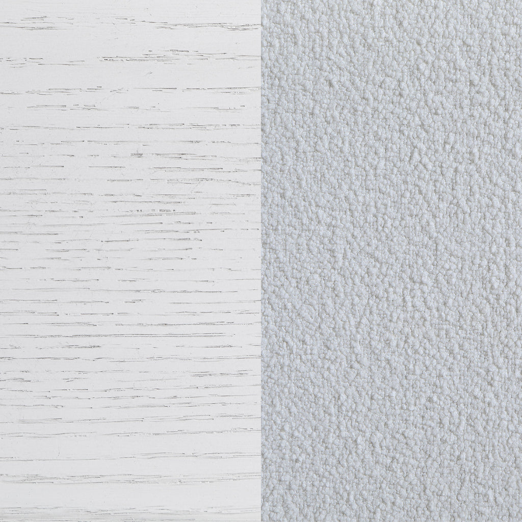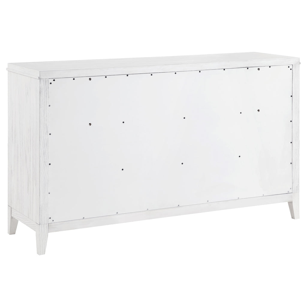 Embrace the fresh, contemporary style of a four-piece bedroom set. A distressed white finish highlights wood grain texture, while clean lines define the set with refined, inviting ambiance. The bed pairs a tall headboard and low footboard for an open profile, creating a modern, sleek look. It includes a six-drawer dresser with a framed mirror, offering ample storage for clothing and linens. A two-drawer nightstand adds bedside storage and provides the perfect spot for a reading lamp or a vase of fresh flowers.