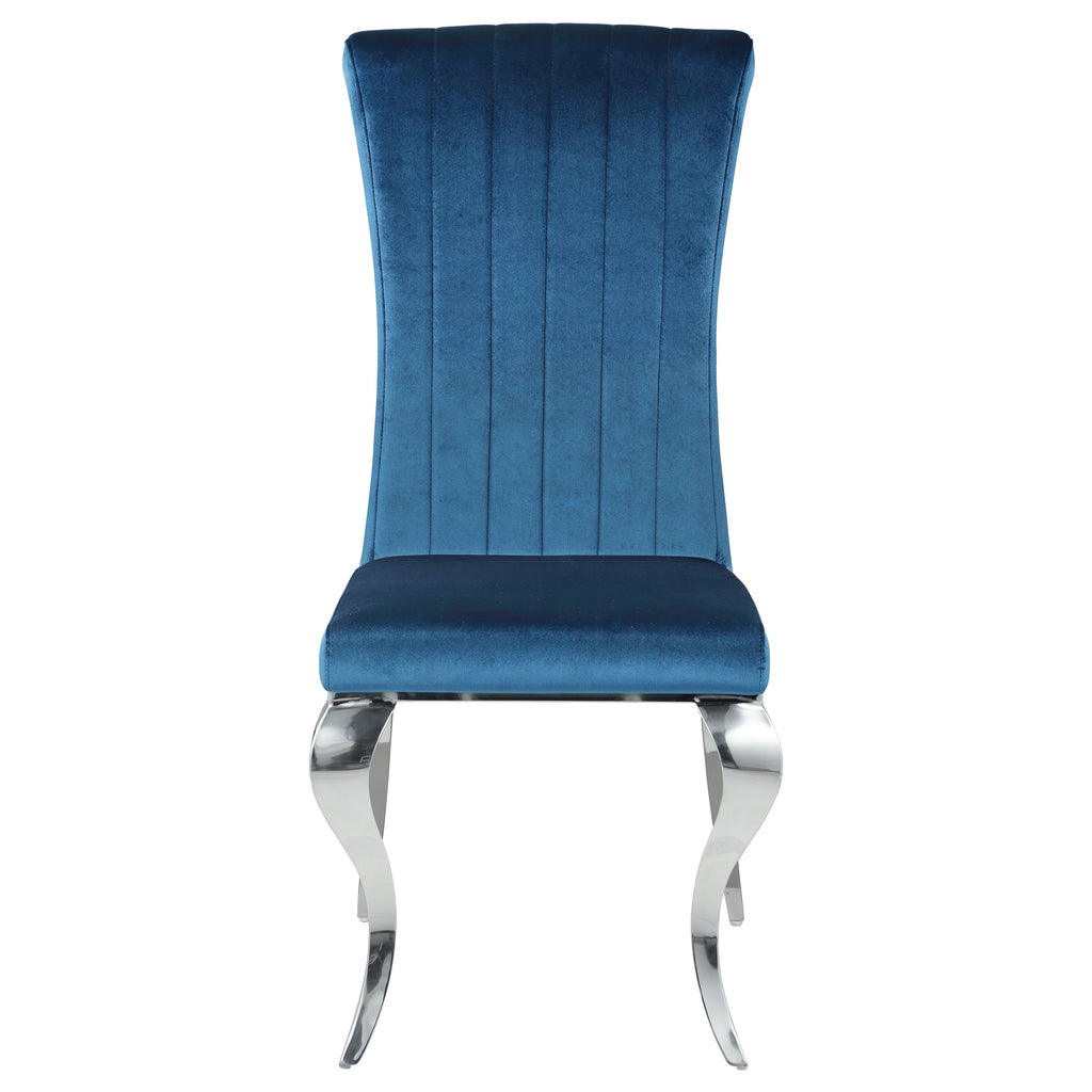 Glam reaches a new level in your modern space as this five-piece dining set pulls out all the stops. Design a gem ensemble in a contemporary setting with this set featuring a rectangular dining table and four side chairs. A pedestal style table is decadent and sparkly with a glass top and mirror trim surrounding its rectangular base and body. Four exquisitely upholstered side chairs add alluring curvature on high backs as well as stainless steel tapered back legs and elegantly flared front legs. Sit with ultimate comfort in chairs featuring generous foam padding.