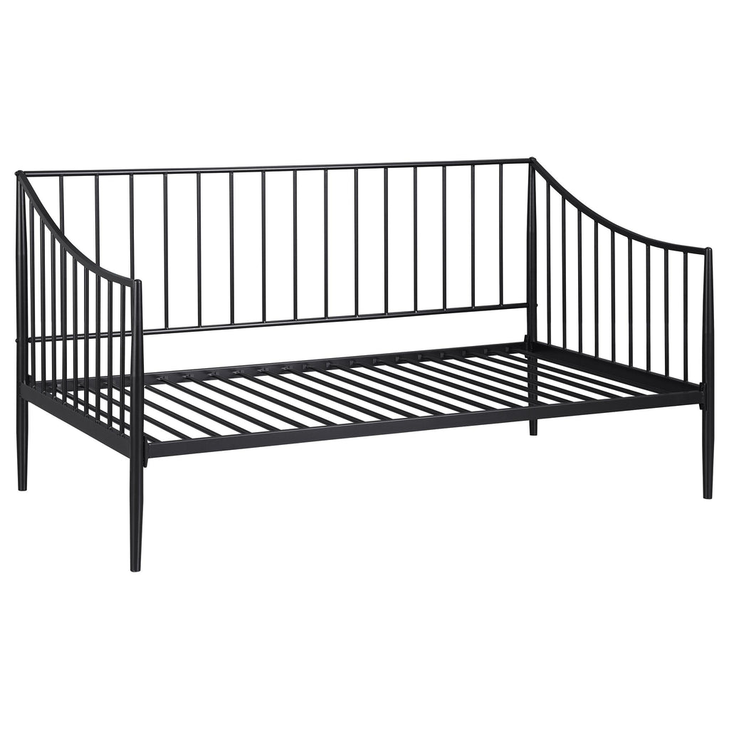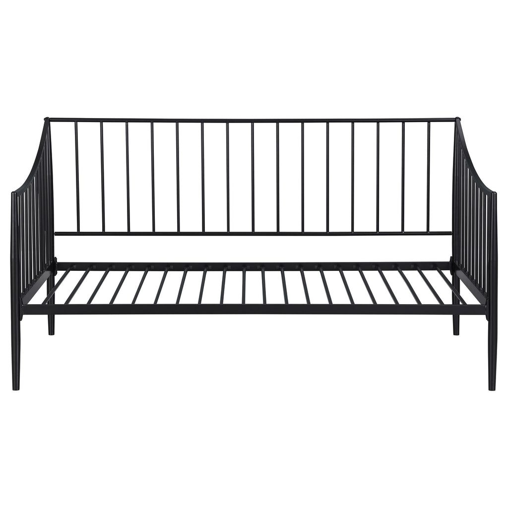 This stylish daybed offers a sleek and practical solution for guestrooms, living rooms, or compact spaces. Constructed from welded metal, it ensures lasting durability and stability. The powder-coated matte black finish enhances its modern, minimalist aesthetic while protecting against wear. Featuring a slatted metal platform, it provides reliable support for a twin mattress without the need for a box spring. Its streamlined design blends seamlessly into various settings, combining functionality with contemporary style.