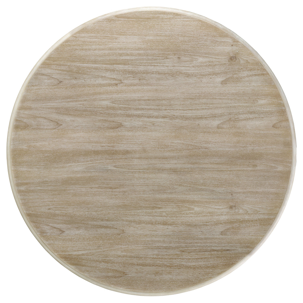 Design your inviting dining space around this modern farmhouse round dining table. Its welcoming ambiance is encouraged with its silhouette, creating a perfect spot for family dinners and easy-going conversation. The table features a decorative base with pedestal style despite its four curvy, flared legs that lean toward a classic look. It features hardwood construction with veneers, all in a white finish with wire brushing that create a distressed, lived-in look and feel. Adda vase of fresh cut flowers or stylish linens and you're all set to go.