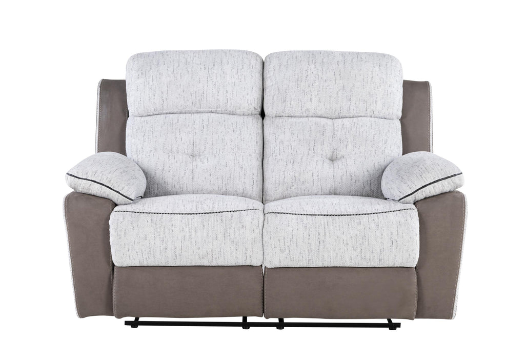 The U5050 Reclining Loveseat offers both comfort and convenience. With manual recline, metal reclining handles, and striking baseball stitching. Its two-tone light and dark grey fabric finish perfectly complements any modern decor.