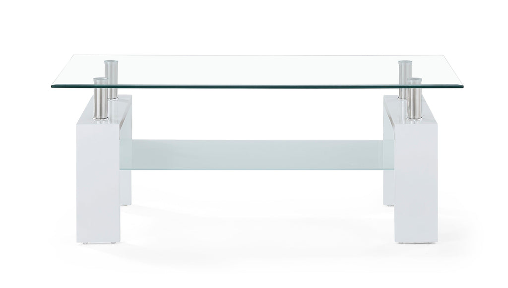 This table is complete with clear top glass and frosted bottom glass with glossy white legs to finish the look.